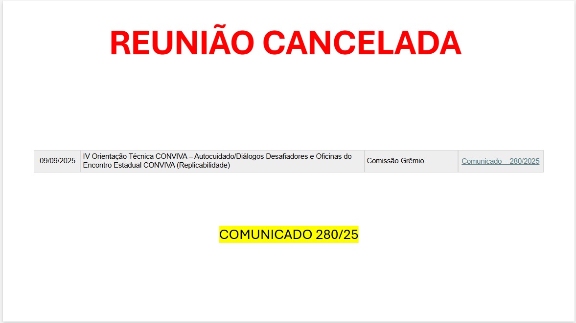 | 02/01/2025 | I Orientação Técnica – CONVIVA/Grêmio/POC – Planejamento – 2025 | Comissão CONVIVA | Comunicado – 01/2025 |